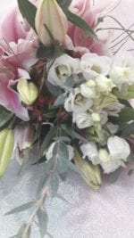 Bouquet with pink lilium, lisianthus (prairie gentian) , alstroemeria (Peruvian lily) and foliage