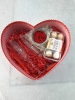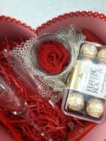Heart-shaped box with 2 champagne glasses, Ferrero chocolates and forever rose